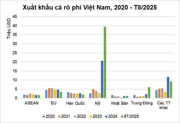 Theo số liệu của Hải quan Việt Nam, 8 tháng đầu năm 2025, XK cá rô phi (trong đó bao gồm cả cá diêu hồng) đạt hơn 63 triệu USD, tăng 174% so với cùng kỳ năm ngoái. Con số này vượt qua kim ngạch XK cá rô phi của Việt Nam trong suốt 5 năm trở lại đây, kể từ năm 2020. Mỹ là thị trường NK nhiều nhất cá rô phi Việt Nam, chiếm đến 62% tỷ trọng trong tổng giá trị cá rô phi Việt Nam XK sang các thị trường.
